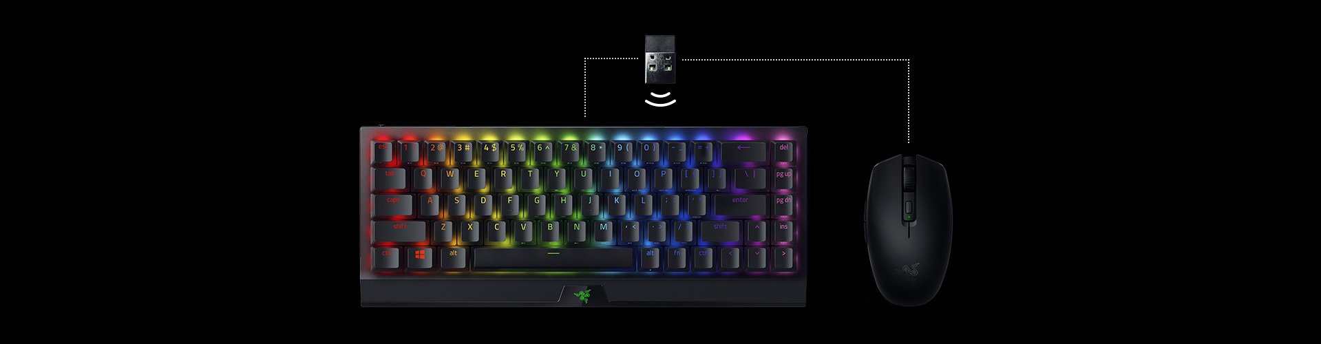 Bàn phím cơ chơi game không dây 65% này được trang bị công nghệ không dây tiên tiến nhất của Razer để chơi game có độ trễ thấp và tốc độ phản hồi và sự tối ưu hóa tần só kết nối và có khả năng chuyển khi tín hiệu bị bão hòa hoặc nhiễu. Với sự hỗ trợ đa thiết bị của chúng tôi, đơn giản hóa thiếp lập của bạn bằng cách kết nối chuột và bàn phím không dây với chỉ duy nhất một dongle.