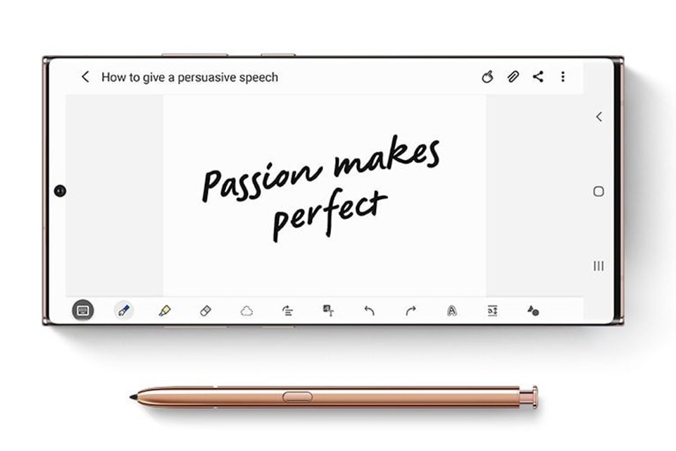 Bạn sẽ được trải nghiệm cây bút cảm ứng cho nét bút tự nhiên, chân thực và mượt mà nhất từ trước đến nay với S Pen mới trên Galaxy Note 20 Ultra. Nhờ độ nhạy vượt trội và màn hình tần số quét 120Hz, thao tác ghi chú của S Pen gần như không có độ trễ, mọi thứ giống như bạn ghi chép trên giấy. Luôn sẵn sàng ghi chú và ghi chú ở bất cứ đâu, từ màn hình khóa cho đến ảnh chụp, S Pen mang đến cho bạn cuộc sống tiện lợi và dễ dàng hơn.
